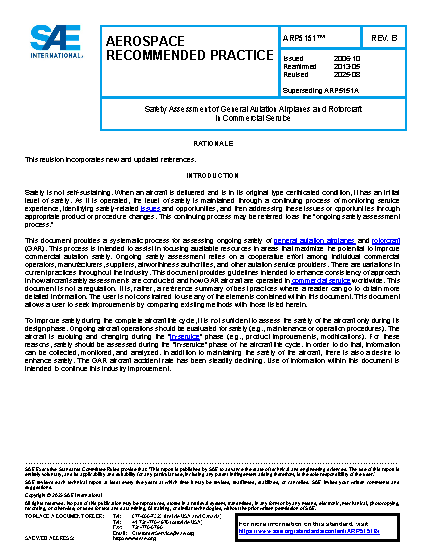 ARP5150 is the recommended practice for the safety assessment of transport airplanes in commercial service. ARP5151 is the recommended practice for the safety assessment process for GAR aircraft in commercial services. While the processes are similar, their implementations are different due to operations, data availability, and sizes of individual operations.