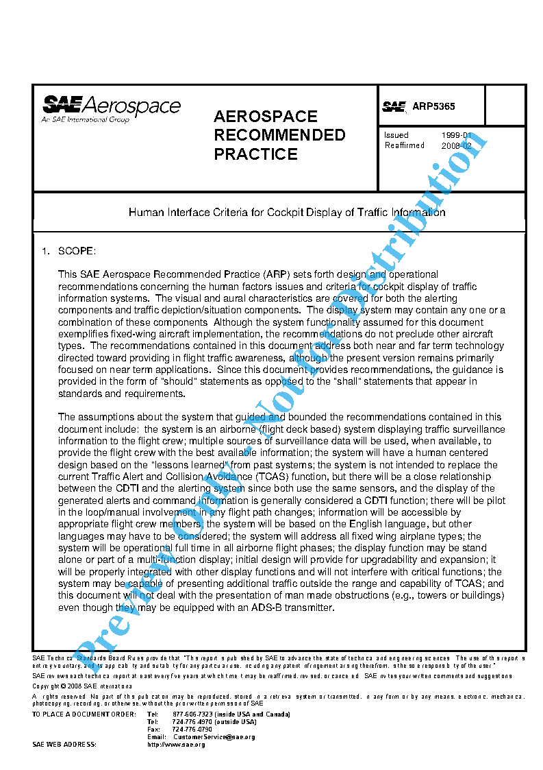 This SAE Aerospace Recommended Practice (ARP) sets forth design and operational recommendations concerning the human factors issues and criteria for cockpit display of traffic information systems. The visual and aural characteristics are covered for both the alerting components and traffic depiction/situation components. The display system may contain any one or a combination of these components Although the system functionality assumed for this document exemplifies fixed-wing aircraft implementation, the recommendations do not preclude other aircraft types. The recommendations contained in this document address both near and far term technology directed toward providing in flight traffic awareness, although the present version remains primarily focused on near term applications. Since this document provides recommendations, the guidance is provided in the form of “should” statements as opposed to the “shall” statements that appear in standards and requirements.