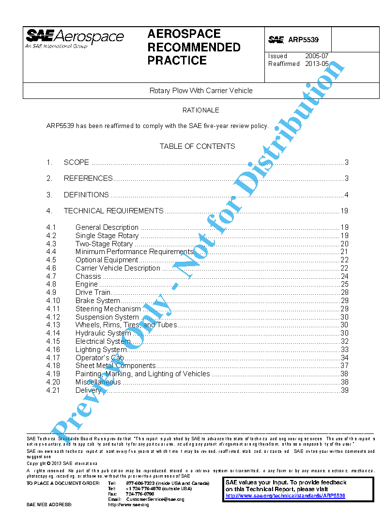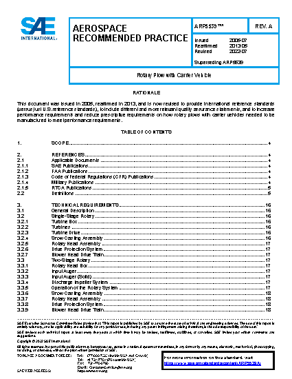 This SAE Aerospace Recommended Practice (ARP) covers requirements for a rotary plow with carrier vehicle primarily used to cast heavy concentrations of snow away from airport operational areas such as runways and taxiways. The term carrier vehicle represents the various self-propelled prime movers that provide the power necessary to move snow and ice control equipment during winter operations.