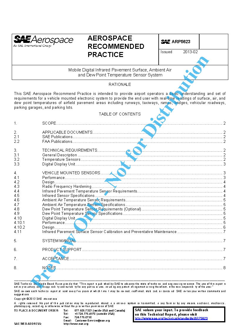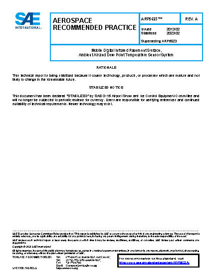 This SAE Aerospace Recommended Practice (ARP) covers the requirements for a combined Mobile Digital Infrared Pavement Surface, Ambient Air, and Dew Point Temperature Sensing System (referred to as the system). The system monitors real-time surface, air and dew point temperatures of airfield pavement areas to ensure safe winter ground operations of aircraft and other vehicles. The vehicle mounted electronic system provides the operator with real-time readings of surface, air and dew point temperatures of airfield pavement areas including runways, taxiways, ramps, bridges, vehicular roadways, parking garages and parking lots. The electronic system shall be available with or without the dew point sensing option.