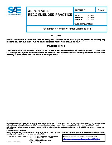 This SAE Aerospace Recommended Practice (ARP) applies to blankets used for passenger comfort within transport category aircraft cabins. When the term “blanket” is used in this document it refers to all blankets that are provided by the aircraft operator for passenger warmth.