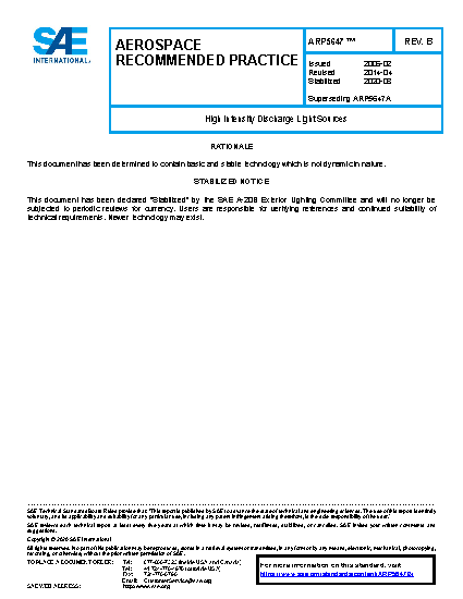 This SAE Aerospace Recommend Practice (ARP) is intended to identify both safety related best practices and unique design considerations of metal halides High Intensity Discharge (HID) lamps and power supplies in aircraft applications.