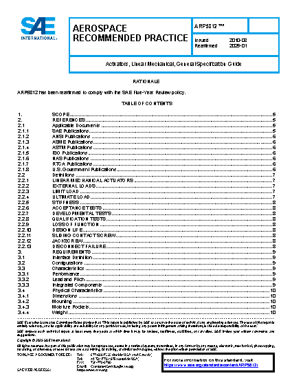 This SAE Aerospace Recommended Practice (ARP) establishes design, manufacturing performance and test requirements for linear mechanical actuators intended to be used for linear motion applications in response to manual or automatic power control system inputs.