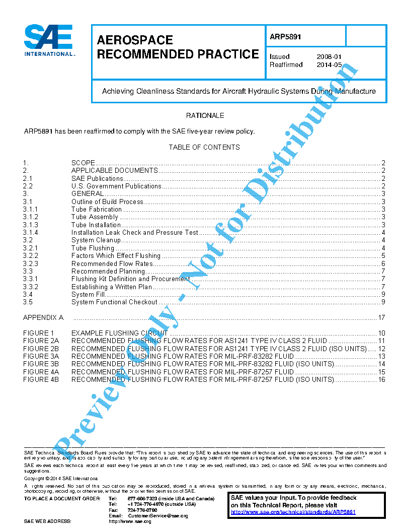 This recommended practice covers exclusion and removal primarily of solid contaminants that occur or are created during these successive steps. The flushing procedure for installed tubing is detailed. This ARP does not address contamination levels of hydraulic fluids as purchased, operation and maintenance of ground carts, details of component cleanliness or of contamination measurement.