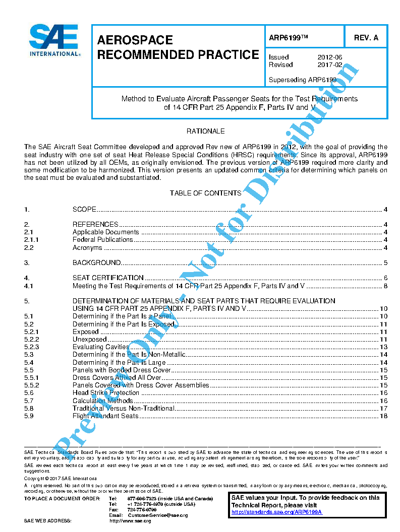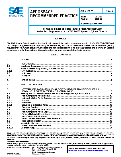 This SAE Aerospace Recommended Practice (ARP) is only applicable to 14 CFR part 25 Transport Airplane passenger seats. This document provides an approach for determining which parts on aircraft seats are required to meet the test requirements of 14 CFR part 25 Appendix F, Parts IV and V. Such materials are referred to as Heat Release Special Conditions (HRSC) compliant]. Additionally, it is recommended to use HRSC compliant materials in applications where not required.