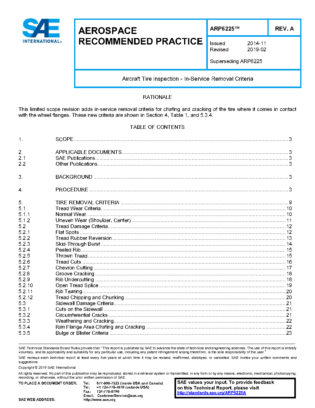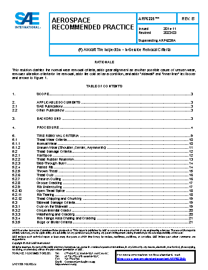 This document is for establishing tire removal criteria of on-wing civil aircraft tires only. This document is primarily intended for use with commercial aircraft, but may be used on other categories of civil aircraft, as applicable. The criteria are harmonized with the Care and Service Manuals of the tire manufacturers for both radial and bias tires.