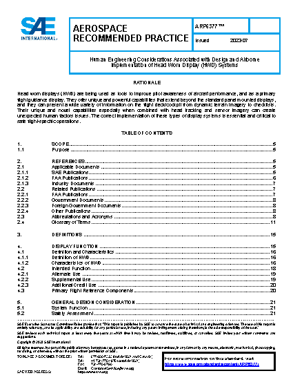 Head worn displays (HWD) can display a variety of information ranging from a full complement of primary flight information (PFI), including enhanced, synthetic, or combined vision system imagery to simple representations of airspeed, altitude, or heading to operationally specific information that may not be related aircraft performance or control. The display functions discussed in this ARP are limited to intended functions related to aircraft control and management and the presentation of PFI.