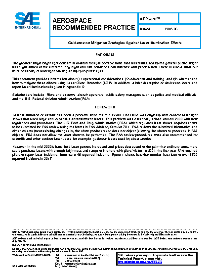 This document is intended to give guidance to users, regulators and persons in the aviation field who may be affected by the potential visual interference effects of lasers aimed at aircraft by the general public. The potential effects include startle (distraction, disruption, disorientation, and operational incapacitation), glare, and flashblindness. This document provides mitigation strategies against such effects, including operational procedures, pilot education, and the use of Laser Glare Protection.