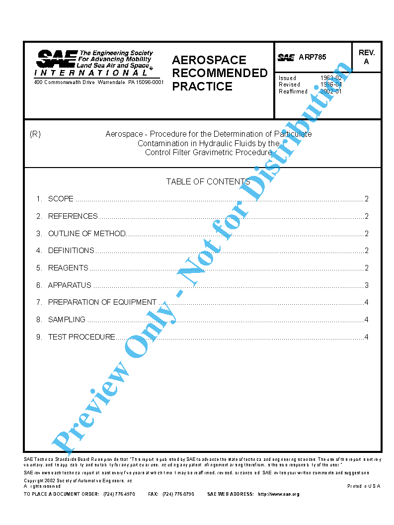 This SAE Aerospace Recommended Practice (ARP) describes a gravimetric method for the determination of particulate contaminant in hydraulic fluids by the control filter technique. With this method detectable contamination levels down to 0.2 mg per sample can be obtained with a standard deviation of ±0.1 mg.