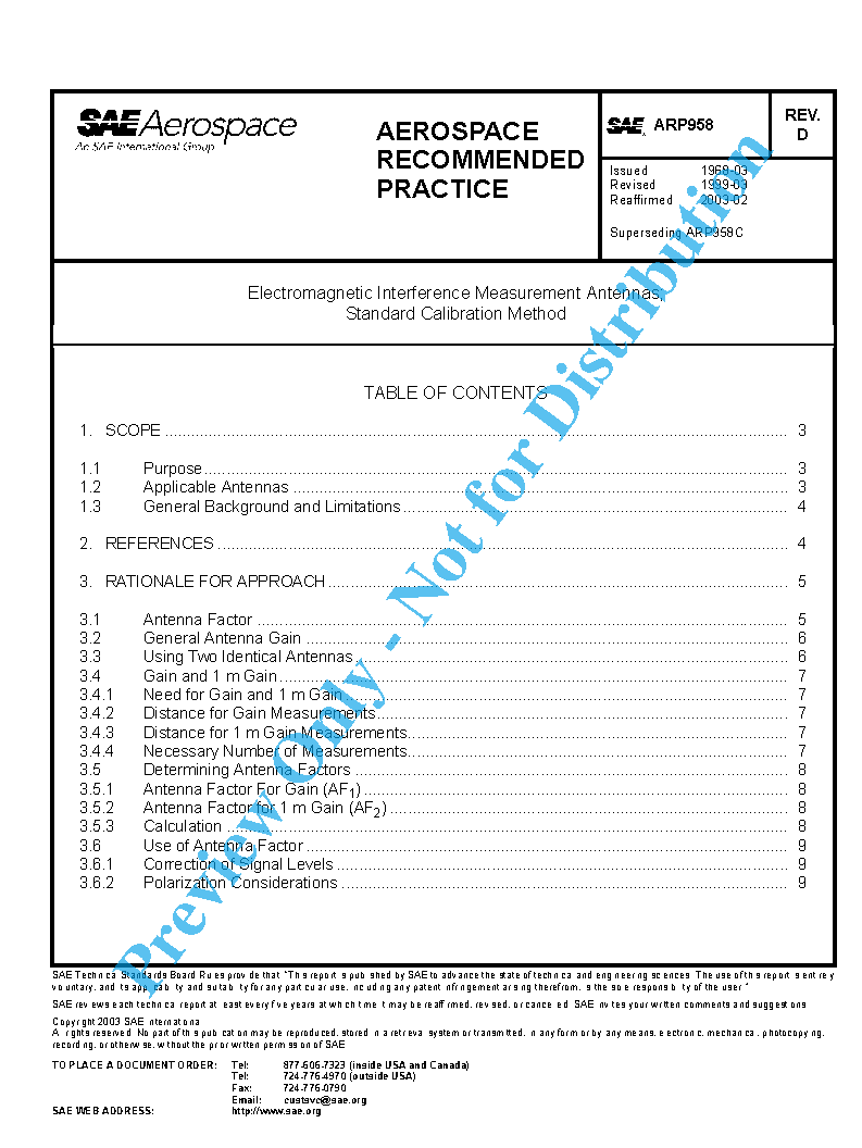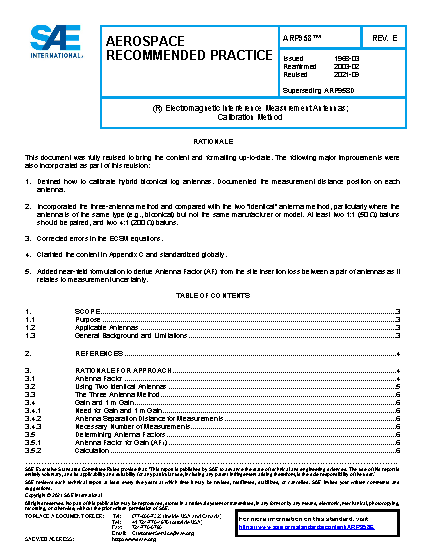 This SAE Aerospace Recommended Practice (ARP) outlines a standard method for the checkout and calibration of electromagnetic interference measurement antennas. Its primary application is for use when measuring a source 1 m from the antenna in a shield room versus a source at a greater distance (far field). This is the typical distance used in performing military EMC testing. Thus, this is a method of calibration. Shield room characteristics are not considered. It does not address an unknown distributed source. Yet it is close to reality since it is based on another antenna that represents a distributed source. This document presents a technique to determine antenna factors for antennas used primarily in performing measurements in accordance with 2.1 and 2.2. The purpose of Revision B is to include the calibration of other antennas, such as small loop antennas that are also specified for use in these same references. Revision D includes a specific procedure for loop antennas that are separated by 1 m from the device under test.