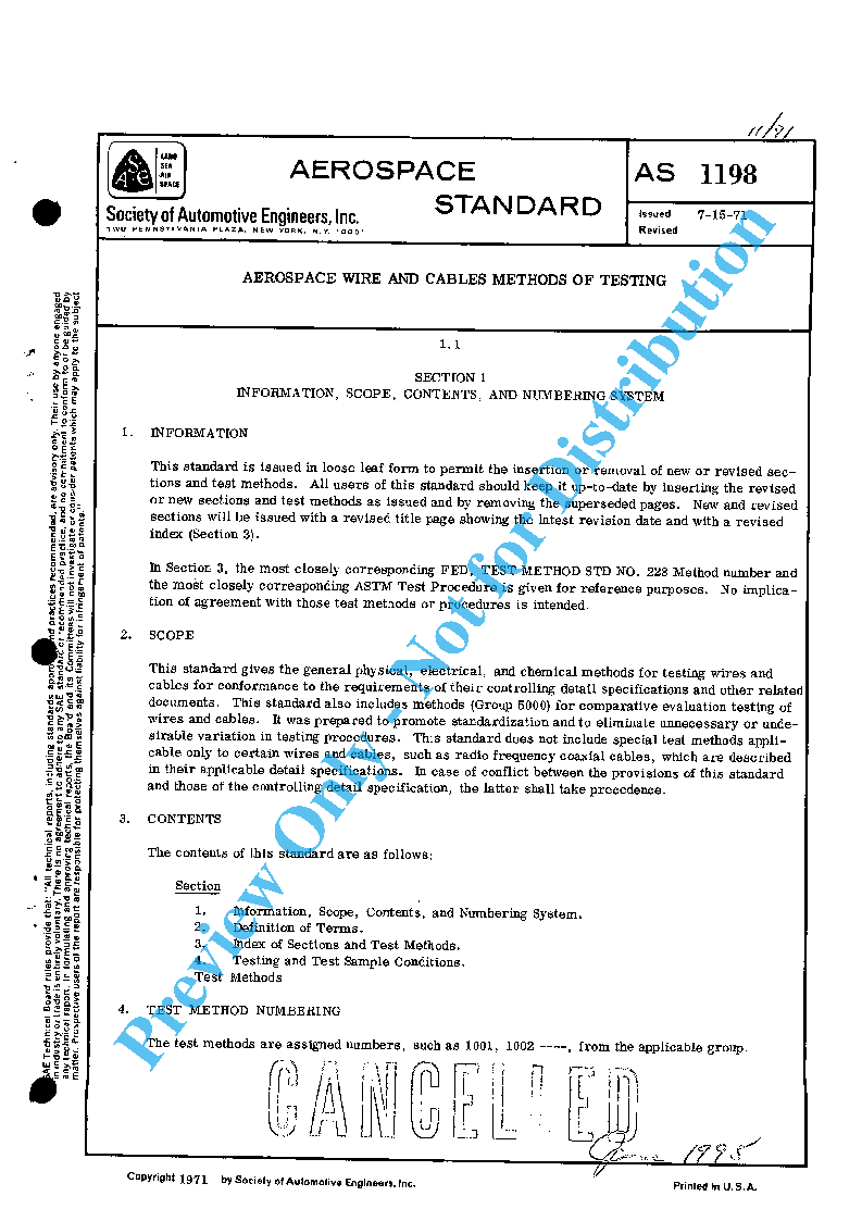 This standard is issued in loose leaf form to permit the insertion or removal of new or revised sections and test methods. All users of this standard should keep it up-to-date by inserting the revised or new sections and test methods as issued and by removing the superseded pages. New and revised sections will be issued with a revised title page showing the latest revision date and with a revised index Section 3). In Section 3, the most closely corresponding FED, TEST METHOD STD NO. 228 Method number and the most closely corresponding ASTM Test Procedure is given for reference purposes. No implication of agreement with those test methods or procedures is intended. This standard gives the general physical, electrical, and chemical methods for testing wires and cables for conformance to the requirements of their controlling detail specifications and other related documents. This standard also includes methods (Group 5000) for comparative evaluation testing of wires and cables. It was prepared to promote standardization and to eliminate unnecessary or undesirable variation in testing procedures. This standard does not include special test methods applicable only to certain wires and cables, such as a radio frequency coasial cables, which are described in their applicable detail specifications. In case of conflict between the provisions of this standard and those of the controlling detail specification, the latter shall take precedence.