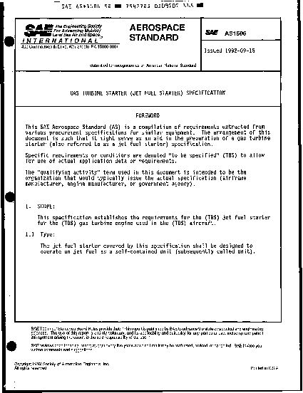 This specification establishes the requirements for the (TBS) jet fuel starter for the (TBS) gas turbine engine used in the (TBS) aircraft.
