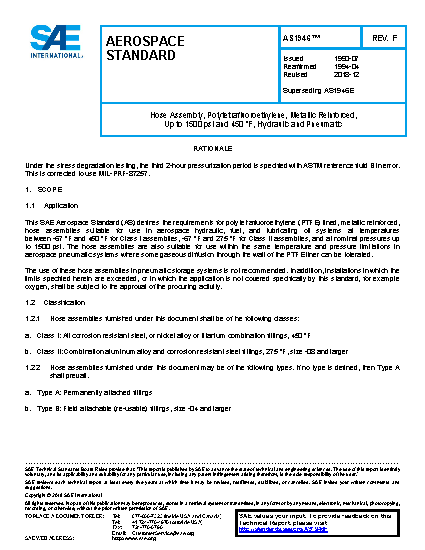 This SAE Aerospace Standard (AS) defines the requirements for polytetrafluoroethylene (PTFE) lined, metallic reinforced, hose assemblies suitable for use in aerospace hydraulic, fuel and lubricating oil systems at temperatures between -67 °F and 450 °F for Class I assemblies, -67 °F and 275 °F for Class II assemblies, and at nominal pressures up to 1500 psi. The hose assemblies are also suitable for use within the same temperature and pressure limitations in aerospace pneumatic systems where some gaseous diffusion through the wall of the PTFE liner can be tolerated. The use of these hose assemblies in pneumatic storage systems is not recommended. In addition, installations in which the limits specified herein are exceeded, or in which the application is not covered specifically by this standard, for example oxygen, shall be subject to the approval of the procuring activity.