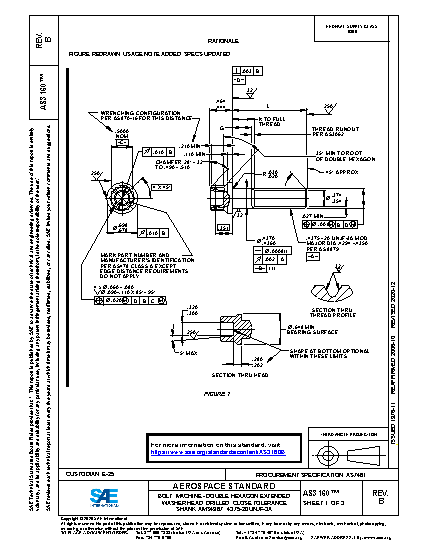 REVISE THREAD SPECIFICATION TO AS8879. REVISE LIGHTENING HOLE CONFIGURATION TO ALLOW OPTIONAL SHAPE AT BOTTOM OF HOLE. DELETE .015 RAD AT BASE OF WRENCH PAD. UPDATE FPI REQUIREMENTS. ADD SURFACE FINISH REQUIREMENTS TO BOLT HEAD AND AS3062 FOR THREAD RUNOUT. UPDATE ANSI Y14.5-1973 TO ANSI Y14.5M-1982. DELETE DUAL DIMENSIONING. GENERAL EDITORIAL UPDATE. REFERENCES UPDATED. FIGURE 1 REDRAWN.