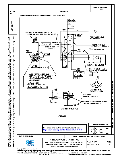 REVISE THREAD SPECIFICATION TO AS8879. REVISE LIGHTENING HOLE CONFIGURATION TO ALLOW OPTIONAL SHAPE AT BOTTOM OF HOLE. DELETE .015 RAD AT BASE OF WRENCH PAD. UPDATE FPI REQUIREMENTS. ADD SURFACE FINISH REQUIREMENTS TO BOLT HEAD AND AS3062 FOR THREAD RUNOUT. UPDATE ANSI Y14.5-1973 TO ANSI Y14.5M-1982. DELETE DUAL DIMENSIONING. GENERAL EDITORIAL UPDATE. REFERENCES UPDATED. FIGURE 1 REDRAWN.