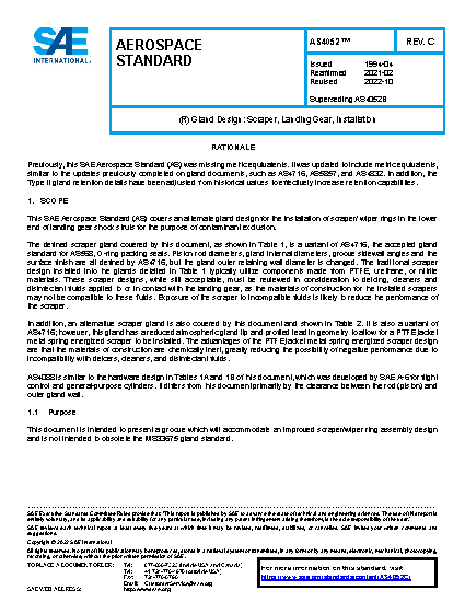 This SAE Aerospace Standard (AS) covers an alternate gland design for the installation of scraper/wiper rings in the lower end of landing gear shock struts for the purpose of contaminant exclusion.