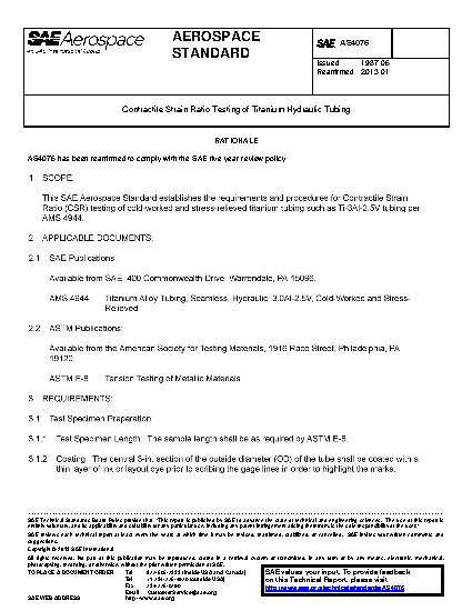 This SAE Aerospace Standard establishes the requirements and procedures for Contractile Strain Ratio (CSR) testing of cold-worked and stress-relieved titanium tubing such as Ti-3AI-2.5V tubing per AMS 4944.