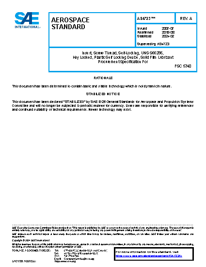 Insert, Screw Thread, Self-Locking, UNS S66286, Key Locked, Plastic Self Locking Device, Solid Film Lubricant Procurement Specification For