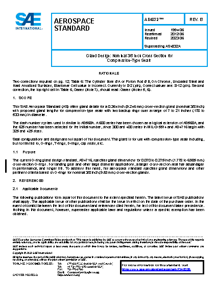 This SAE Aerospace Standard (AS) offers gland details for a 0.364 inch (9.246 mm) cross-section gland (nominal 3/8 inch) with proposed gland lengths for compression-type seals with two backup rings over a range of 7 to 21 inches (178 to 533 mm) in diameter.
