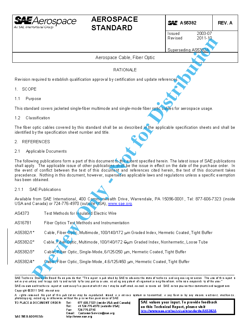 This standard covers jacketed single-fiber multimode and single-mode fiber optic cables for aerospace usage.