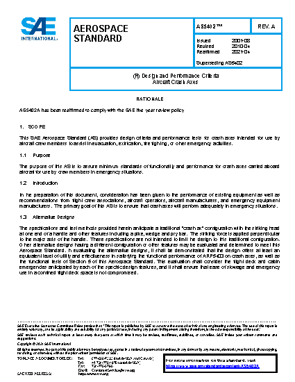 This SAE Aerospace Standard (AS) provides design criteria and performance tests for crash axes intended for use by aircraft crew members to assist in evacuation, extrication, fire fighting, or other emergency activities.