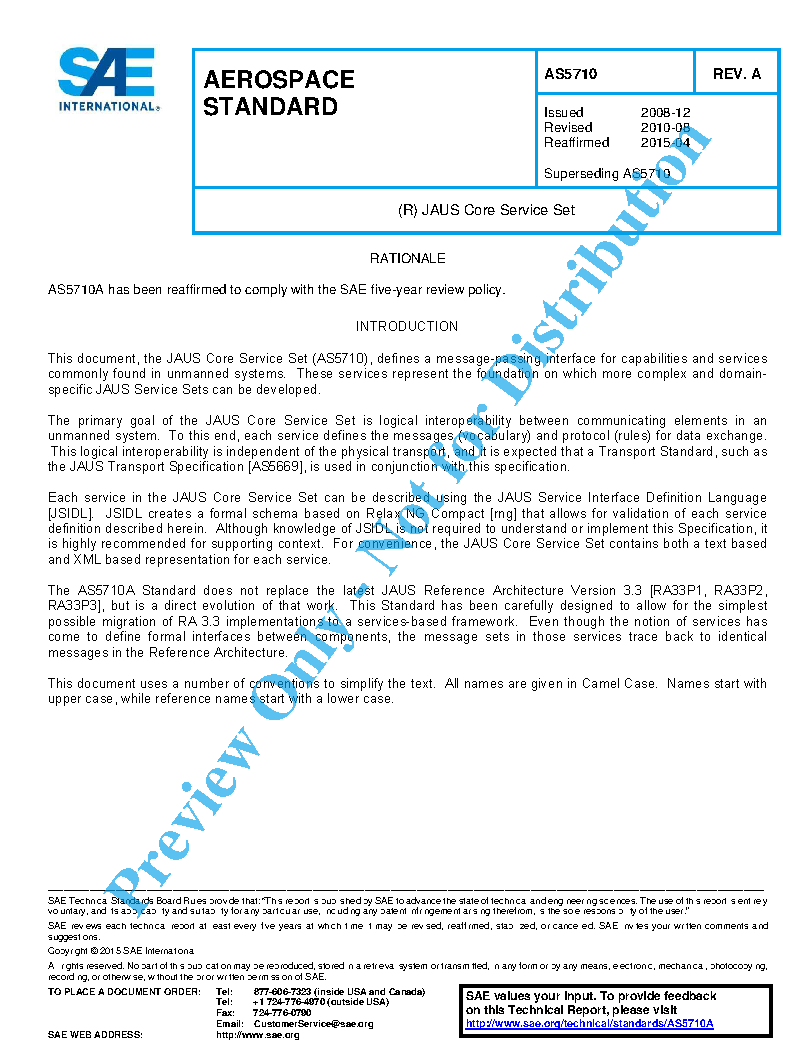This document defines a set of standard application layer interfaces called JAUS Core Services. JAUS Services provide the means for software entities in an unmanned system or system of unmanned systems to communicate and coordinate their activities. The Core Services represent the infrastructure commonly found across all domains and types of unmanned systems. At present, seven services are defined in this document: o Transport Service: Abstracts the functionality of the underlying communication transport layer o Events Service: Establishes a publish/subscribe mechanism for automatic messaging o Access Control: Manages preemptable exclusive control for safety critical operations o Management: Defines component life-cycle management o Time: Allows clients to query and set the system time for the component o Liveness: Provides a means to maintain connection liveness between communicating components o Discovery: Governs automatic discovery of remote entities and their capabilities Each service is described by a JAUS Service Definition (JSD) which specifies the message set and protocol required for compliance. Each JSD is fully compliant with the JAUS Service Interface Definition Language [JSIDL].