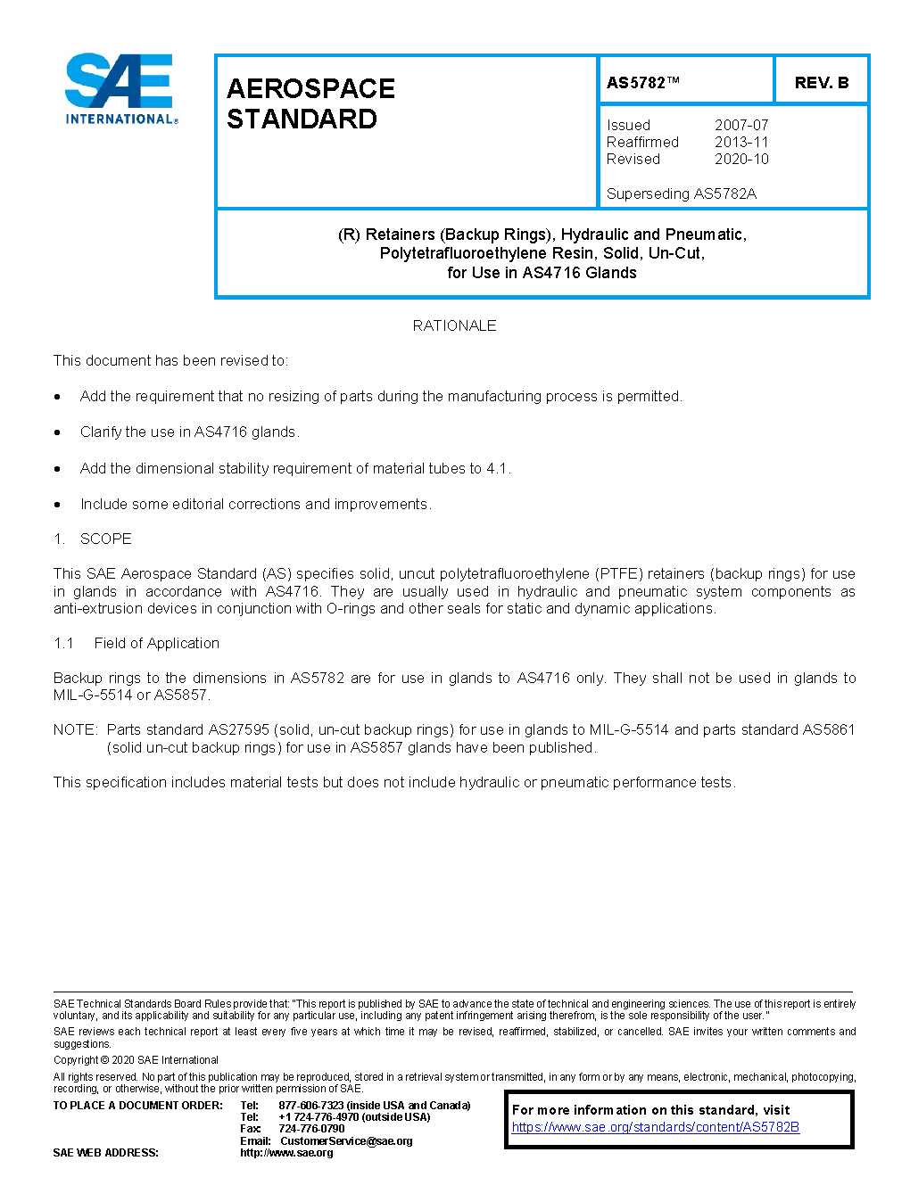 This SAE Aerospace Standard (AS) covers solid, uncut polytetrafluoroethylene (PTFE) retainers (backup rings) for use in glands in accordance with AS4716. They are for use in hydraulic and pneumatic system components as anti-extrusion devices in conjunction with O-rings, packings and other elastomeric seals for static and dynamic applications.