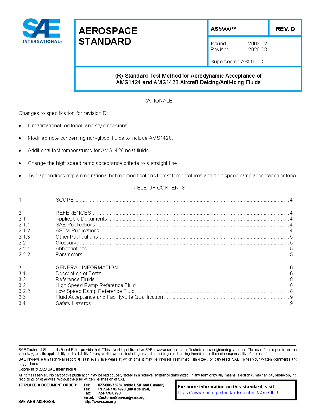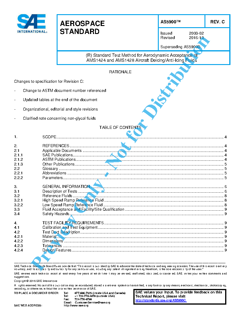 The objective of this standard is to ensure acceptable aerodynamic characteristics of the deicing/anti-icing fluids as they flow off of aircraft lifting and control surfaces during the takeoff ground acceleration and climb. Aerodynamic acceptance of an aircraft ground deicing/anti-icing fluid is based upon the fluid’s boundary layer displacement thickness (BLDT) on a flat plate, measured after experiencing the free stream velocity time history of a representative aircraft takeoff. Acceptability of the fluid is determined by comparing BLDT measurements of the candidate fluid with a datum established from the values of a reference fluid BLDT and the BLDT over the dry (clean) test plate. Testing is carried out in the temperature range at which the fluid, undiluted and diluted, is to be used in airline service.