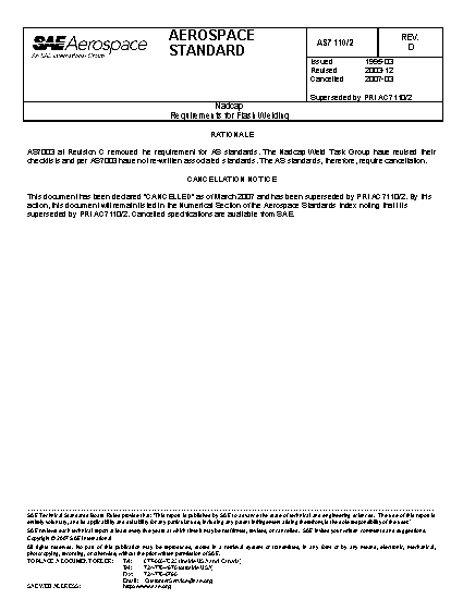 This document has been declared "CANCELLED" as of March 2007 and has been superseded by PRI AC7110/2. By this action, this document will remain listed in the Numerical Section of the Aerospace Standards Index noting that it is superseded by PRI AC7110/2. Cancelled specifications are available from SAE..