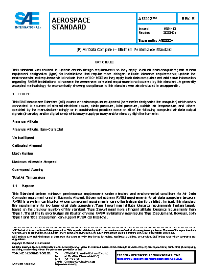 This SAE Aerospace Standard (AS) covers air data computer equipment (hereinafter designated the computer) which when connected to sources of aircraft electrical power, static pressure, total pressure, outside air temperature, and others specified by the manufacturer (singly or in combination) provides some or all of the following computed air data output signals (in analog and/or digital form) which may supply primary flight instruments: