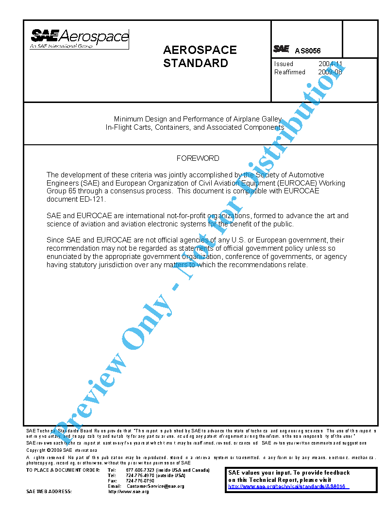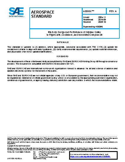 This SAE Aerospace Standard (AS) establishes minimum design and performance requirements for carts, containers and associated components intended for installation in galleys and other areas of transport category airplanes. The requirements include establishing installation criteria for use by compartment designers and installers of the equipment.
