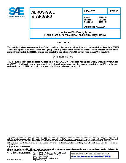 This standard includes selected quality system requirements from ISO 9001:2008 [1] and AS9100:2009 applicable to noncomplex products and associated manufacturing processes. ISO 9001 text incorporated into this standard appears in standard font; while aviation, space, and defense industry additional requirements, definitions, and notes are presented in bold, italic text.