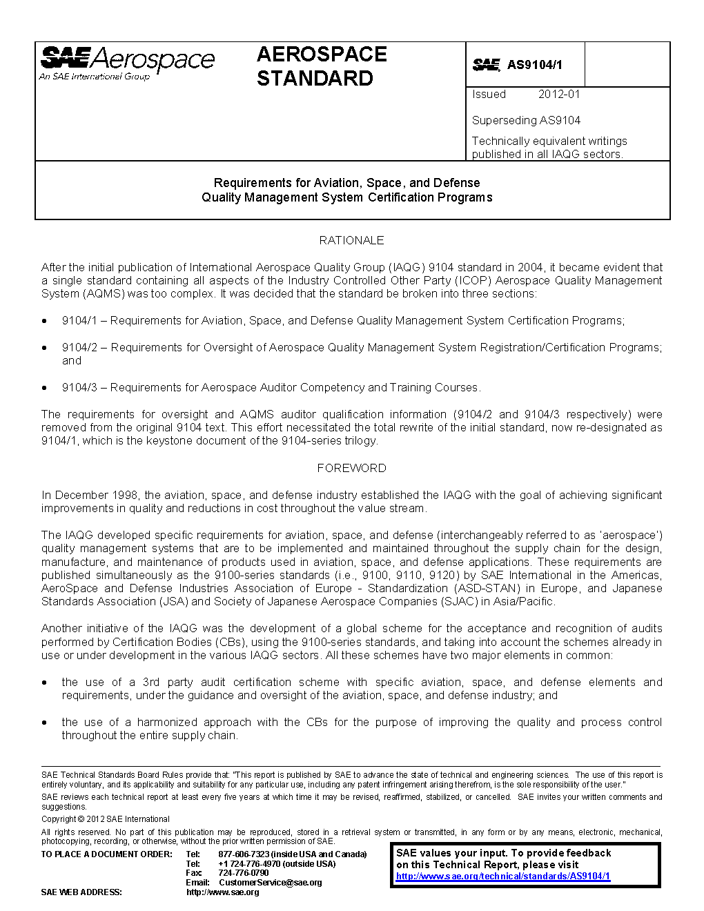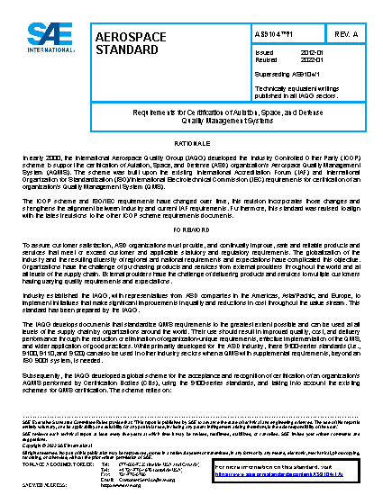 Requirements for Certification of Aviation, Space, and Defense Quality Management Systems