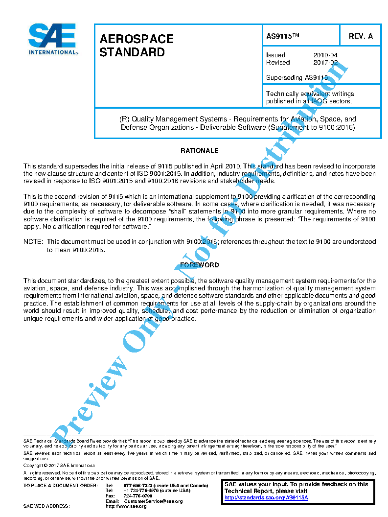 Quality Management Systems - Requirements for Aviation, Space, and Defense Organizations - Deliverable Software (Supplement to 9100:2016)