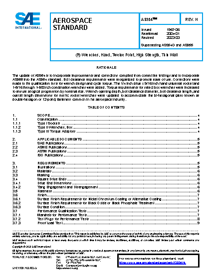 This SAE Aerospace Standard (AS) covers high strength thin wall (commercial) sockets, universal sockets, box wrenches and torque adaptors which possess the strength, clearances, and internal wrenching design so configured that, when mated with 12-point fasteners conforming to the requirement of AS870, they shall transmit torque to the fastener without bearing on the outer 5% of the fastener's wrenching points.