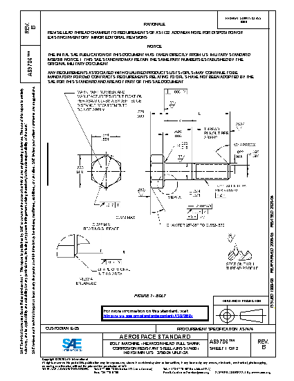 UPDATE THREAD SPECIFICATION TO AS8879, UPDATE TO ANSI Y14.5M-1982, REVISE FPI REQUIREMENTS TO ASTM E1417/1417M, ADD EDGE DISTANCE EXCEPTION FOR HEAD MARKING, REVISE ACROSS POINTS AND ACROSS FLATS DIMENSIONS, ADD AS3062 FOR THREAD RUNOUT, CONVERT GD&T NOTES TO FEATURE CONTROL FRAMES, DATUMS, AND SYMBOLS, ADD SURFACE TEXTURE REQUIREMENTS FOR TOP AND END, ADD SURFACE TEXTURE SYMBOLS PER ASME Y14.36M, FIGURE 1 REDRAWN AND GENERAL EDITORIAL UPDATE