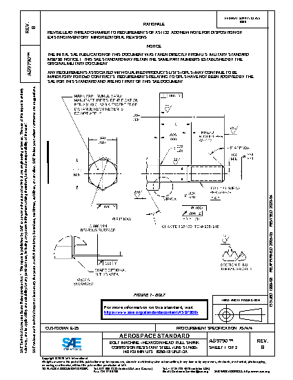 UPDATE THREAD SPECIFICATION TO AS8879, UPDATE TO ANSI Y14.5M-1982, REVISE FPI REQUIREMENTS TO ASTM E1417/1417M, ADD EDGE DISTANCE EXCEPTION FOR HEAD MARKING, REVISE ACROSS POINTS DIMENSION, ADD AS3062 FOR THREAD RUNOUT, CONVERT GD&T NOTES TO FEATURE CONTROL FRAMES, DATUMS, AND SYMBOLS, ADD SURFACE TEXTURE REQUIREMENTS FOR TOP AND END, ADD SURFACE TEXTURE SYMBOLS PER ASME Y14.36M, FIGURE 1 REDRAWN AND GENERAL EDITORIAL UPDATE.