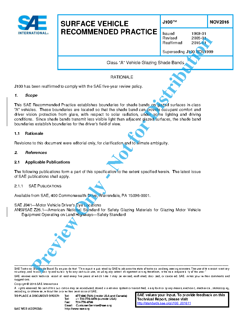 This SAE Recommended Practice establishes boundaries for shade bands on glazed surfaces in class "A" vehicles. These boundaries are located so that the shade band can provide occupant comfort and driver vision protection from glare, with respect to solar radiation, under some lighting and driving conditions. Since shade bands transmit less visible light than adjacent glazed surfaces, the shade band boundaries establish boundaries for the driver's field of view.