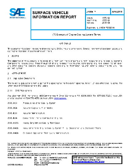 The objective of this glossary is to establish uniform definitions of parts and terminology for engine cooling systems. Components included are all those through which engine coolant is circulated: water pump, engine oil cooler, transmission and other coolant-oil coolers, charge air coolers, core engine, thermostat, radiator, external coolant tanks, and lines connecting them.