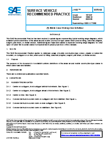 This SAE Recommended Practice applies to stationary usage of mobile construction-type cranes, crawler or rubber-tire mounted, on outriggers or on tires, when used for lifting, clamshell, dragline, magnet, pile driver, or similar service.