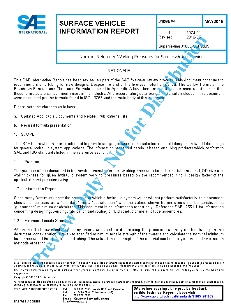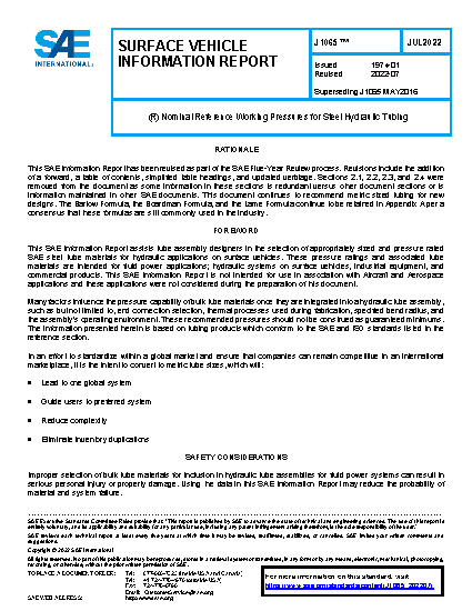 This SAE Information Report is intended to provide design guidance in the selection of steel tubing and related tube fittings for general hydraulic system applications. The information presented herein is based on tubing products which conform to SAE and ISO standards listed in the reference section. All pressure rating data found in the charts included in this document are calculated per the formula found in ISO 10763 and the main body of this document.