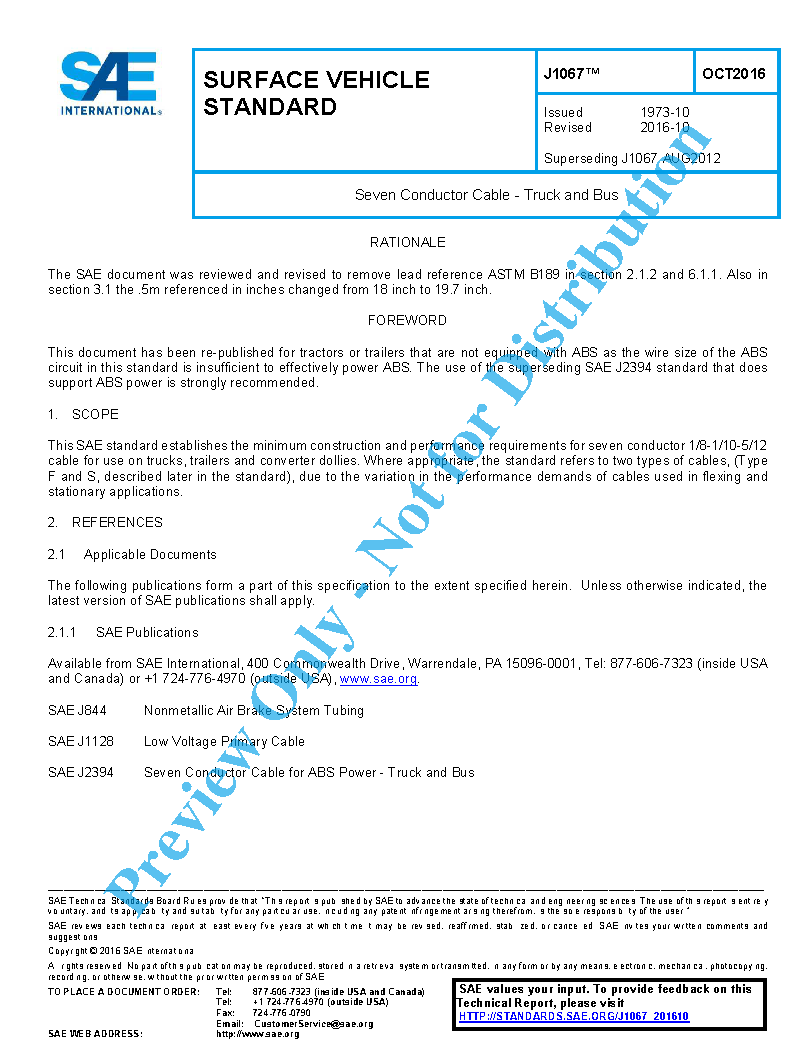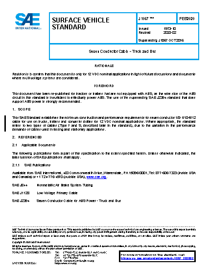 This SAE Standard establishes the minimum construction and performance requirements for seven conductor 1/8-1/10-5/12 cable for use on trucks, trailers and converter dollies for 12 VDC nominal applications. Where appropriate, the standard refers to two types of cables (Type F and S, described later in the standard), due to the variation in the performance demands of cables used in flexing and stationary applications.
