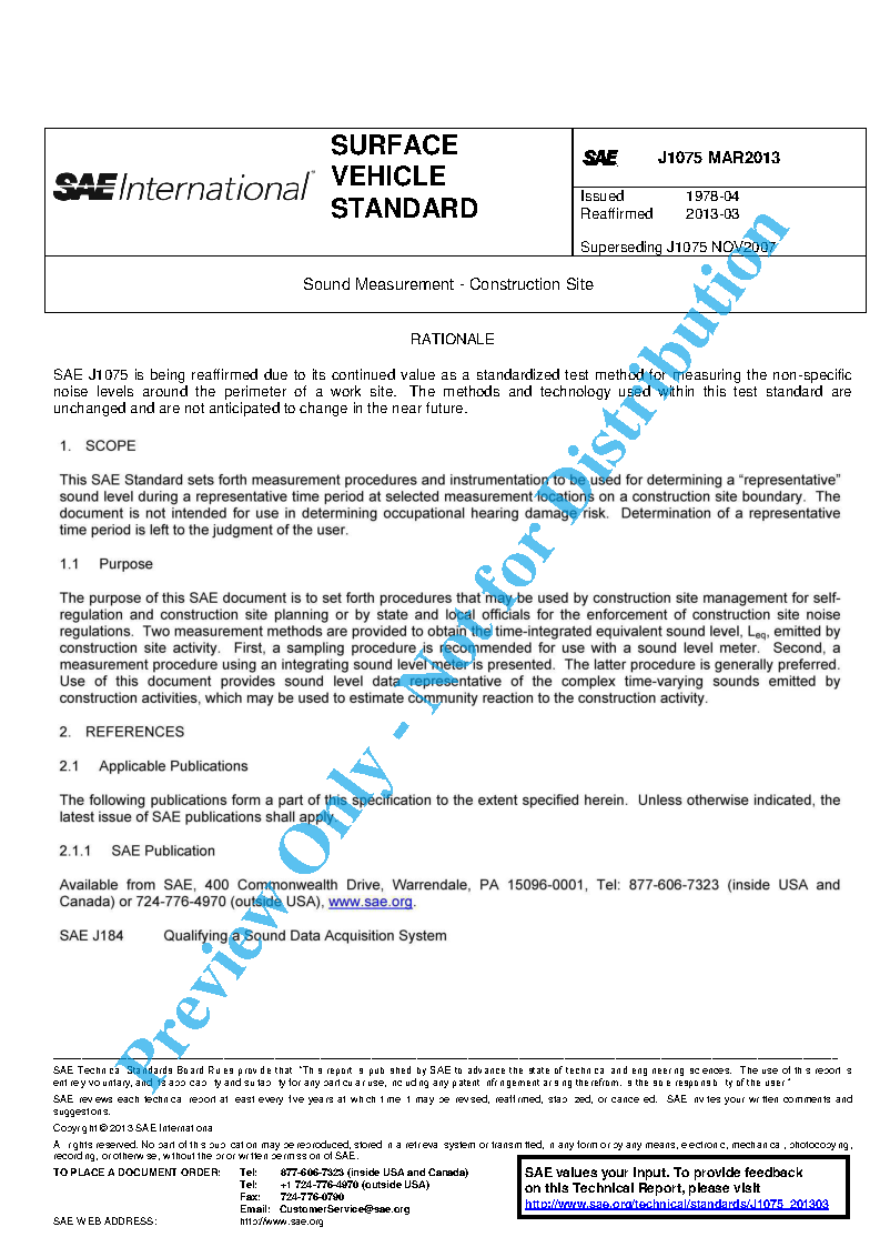 This SAE Standard sets forth measurement procedures and instrumentation to be used for determining a “representative” sound level during a representative time period at selected measurement locations on a construction site boundary. The document is not intended for use in determining occupational hearing damage risk. Determination of a representative time period is left to the judgment of the user.
