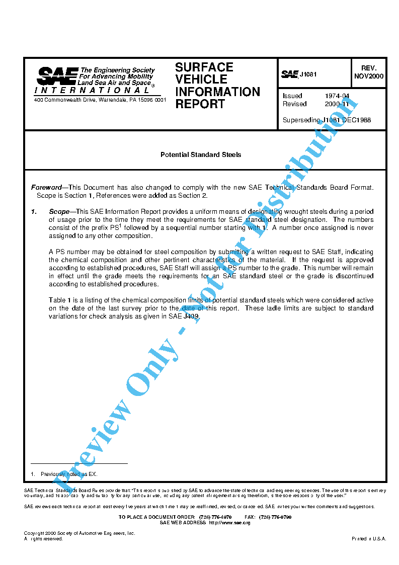 This SAE Information Report provides a uniform means of designating wrought steels during a period of usage prior to the time they meet the requirements for SAE standard steel designation. The numbers consist of the prefix PS 1 followed by a sequential number starting with 1. A number once assigned is never assigned to any other composition.