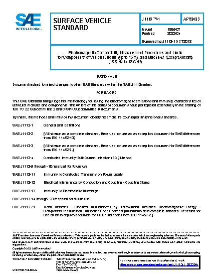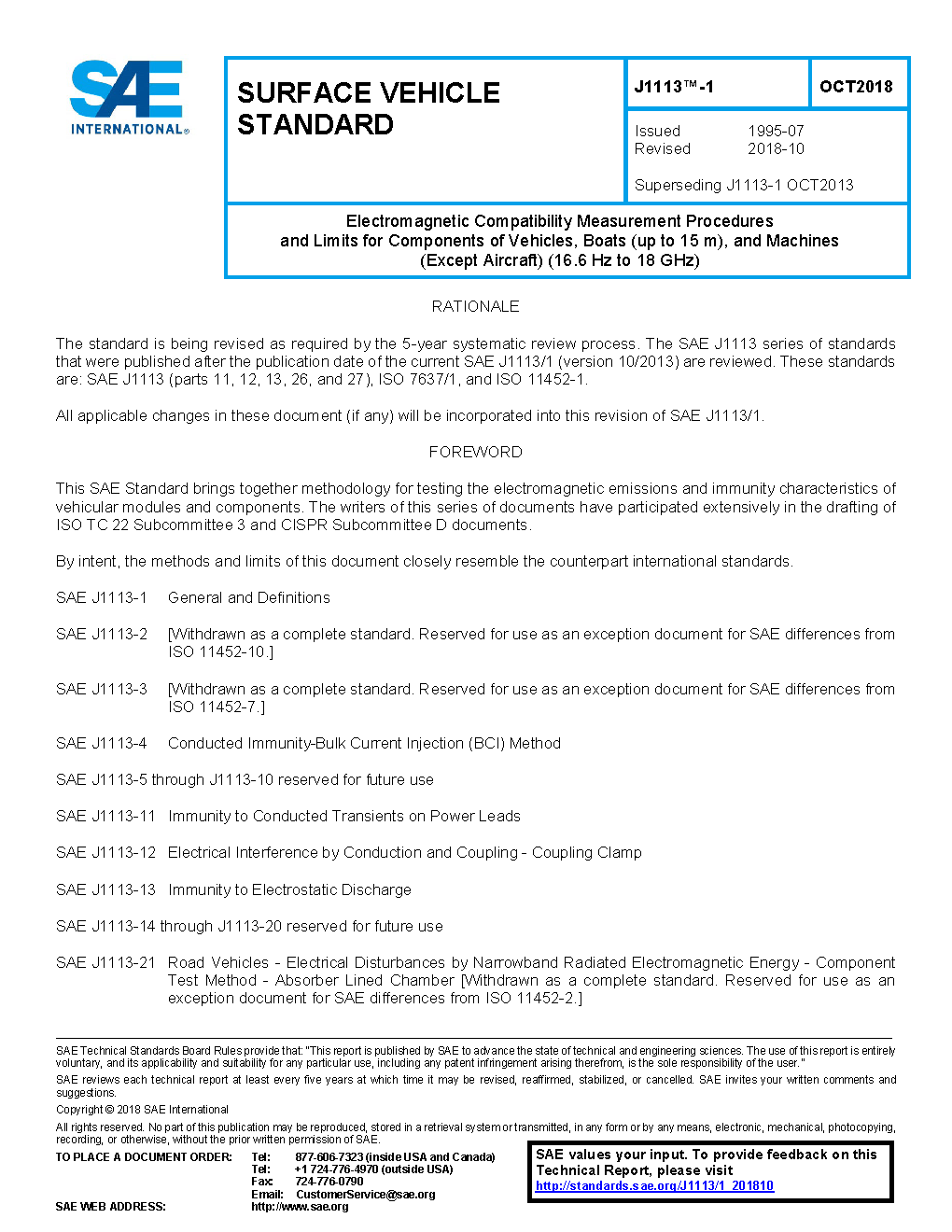 By reference, ISO 11452-3, ISO 11452-7, ISO 11452-8, ISO 11452-10, ISO 11452-11, ISO 11452-2, and the emissions portion of ISO 7637-2 are adopted in place of SAE J1113-24, SAE J1113-3, SAE J1113-22, SAE J1113-2, SAE J1113-28, SAE J1113-21, and SAE J1113-42, respectively. In the event that an amendment is made, or a new edition is published, the new ISO document shall become part of this standard 6 months after the publication of the ISO document. SAE reserves the right to identify exceptions to the published ISO document with the exceptions to be documented in SAE J1113-24, SAE J1113-3, SAE J1113-22, SAE J1113-2, SAE J1113-28, SAE J1113-21, and SAE J1113-42, respectively.