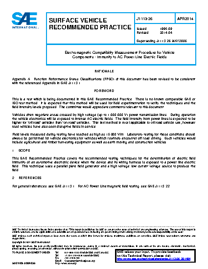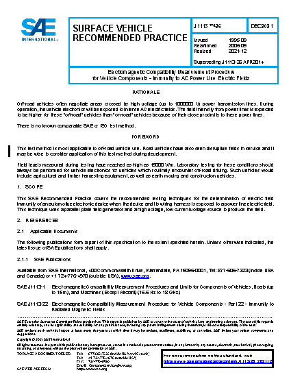 This SAE Recommended Practice covers the recommended testing techniques for the determination of electric field immunity of an automotive electronic device when the device and its wiring harness is exposed to a power line electric field. This technique uses a parallel plate field generator and a high voltage, low current voltage source to produce the field.