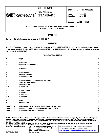 This part of SAE J1113 specifies the direct RF power injection test method and procedure for testing electromagnetic immunity of electronic components for passenger cars and commercial vehicles. The electromagnetic disturbances considered in this part of SAE J1113 are limited to continuous, narrowband conducted RF energy.