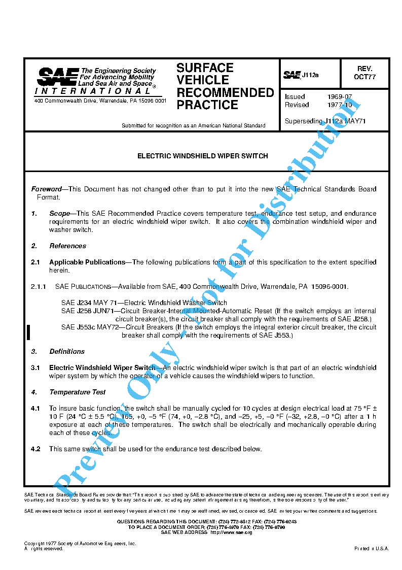This SAE Recommended Practice covers temperature test, endurance test setup, and endurance requirements for an electric windshield wiper switch. It also covers the combination windshield wiper and washer switch.