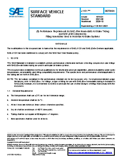 This document also establishes minimum qualifications for tensile and pressure capabilities, vibration durability under cyclic temperatures, serviceability, and fitting compatibility requirements. The specific tests and performance criteria applicable to the tubing are set forth in SAE J844.