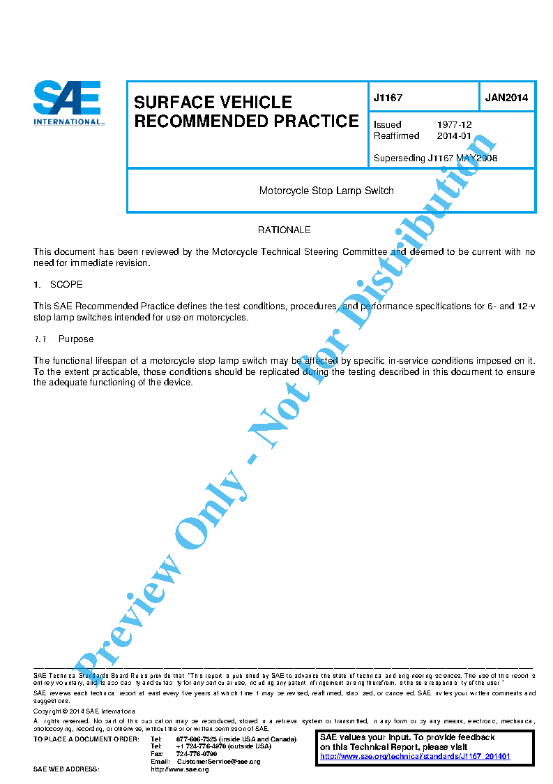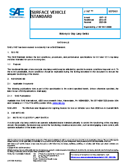 This SAE Standard defines the test conditions, procedures, and performance specifications for 6 V and 12 V stop lamp switches intended for use on motorcycles.
